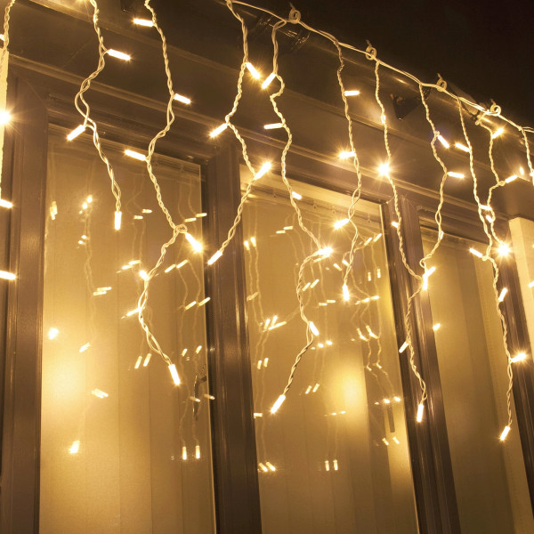 Instalatii Luminoase de Craciun cu Franjuri Inegali 35m 700 LED-uri, Protectie Exterior IP44, Fir Alb, Prelungibila in Serie, cu joc de lumina tip Flash. Aceste instalatii de Craciun sunt ideale pentru decorarea casei dumneavoastra, pozitionate sub acoperis, la streasina.