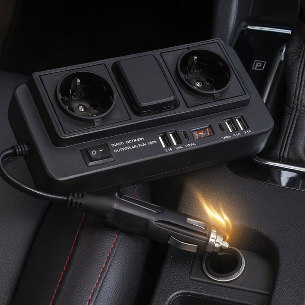 Soluție completă de alimentare portabilă pentru mașină, cabană sau situații de urgență. Acest invertor transformă tensiunea de 12V/24V DC de la bateria auto în 220V AC, oferind și porturi USB multiple pentru încărcare rapidă a dispozitivelor. Ideal pentru călătorii, camping sau lucru la distanță.