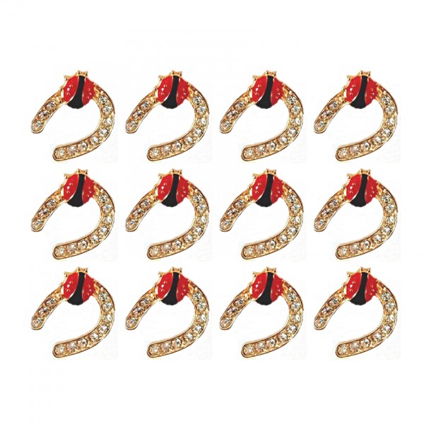 Setul contine 12 martisoare Brosa pentru Femei, design deosebit, cu potcoave aurii cu buburuze rosii si strasuri transparente, tip martisor brosa.