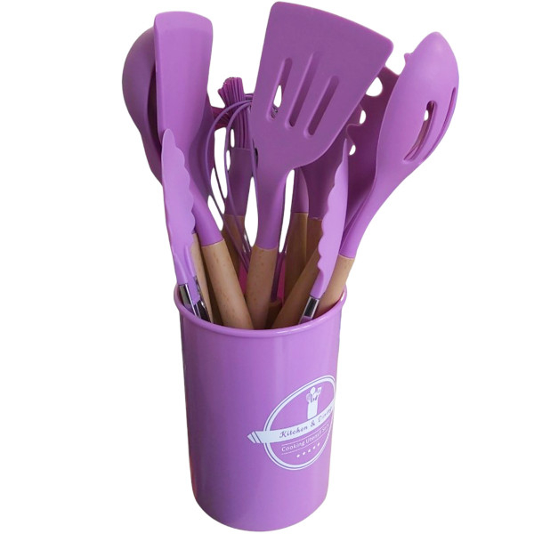 Set 12 Ustensile Bucatarie din silicon cu maner lemn si suport WX DNC59441