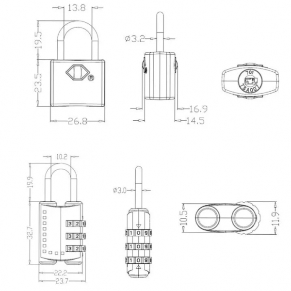 Lacatele sunt realizate din alama. Cele negre au corpul cu dimensiunea 26.8 x 23.5 x 14.5 mm (L x l x g), iar lacatul cu cifru are dimensiunea 32.7 x 23.7 x 11.9 mm (L x l x g).