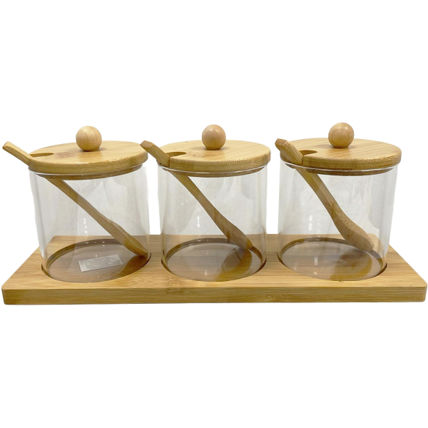 Set 3 Recipiente Condimente din Sticla cu Capac si Suport Lemn 3-45 CNN52926