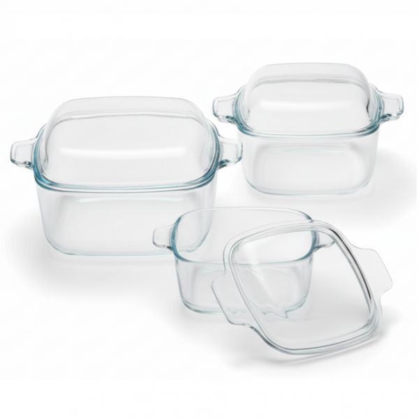 Set 3 vase din sticla termorezistenta, patrate, cu capace din sticla