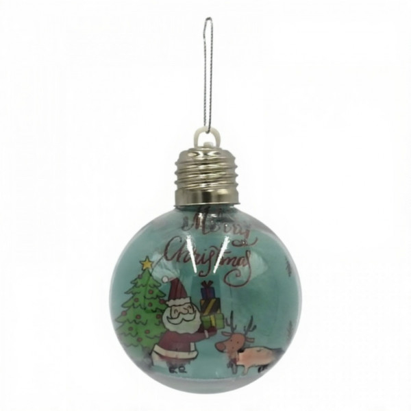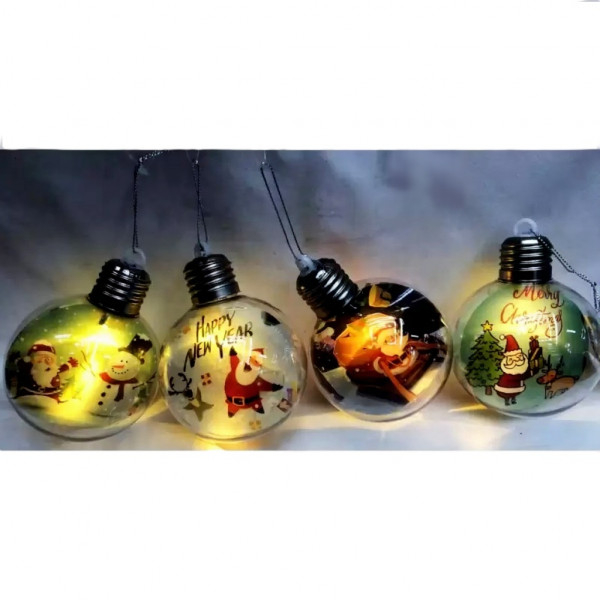 Acest glob de brad luminos de 8 cm, confecționat din PVC durabil, este mai mult decât un simplu ornament. Designul său sub formă de bec aduce o notă inedită decorului tău festiv. Imaginile imprimate în interiorul globului – scene cu Moș Crăciun, om de zăpadă, brad împodobit și mesaje de „Happy New Year” și „Merry Christmas” – creează o atmosferă festivă de neuitat. Lumina caldă din interior evidențiază aceste detalii, transformând fiecare glob într-un punct focal al bradului tău.