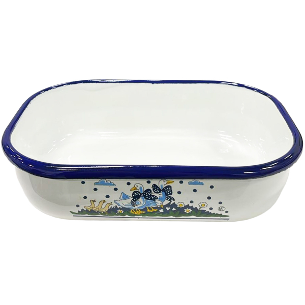 Tava de copt din email este ideală pentru prepararea unei game largi de mâncăruri dulci și sărate.